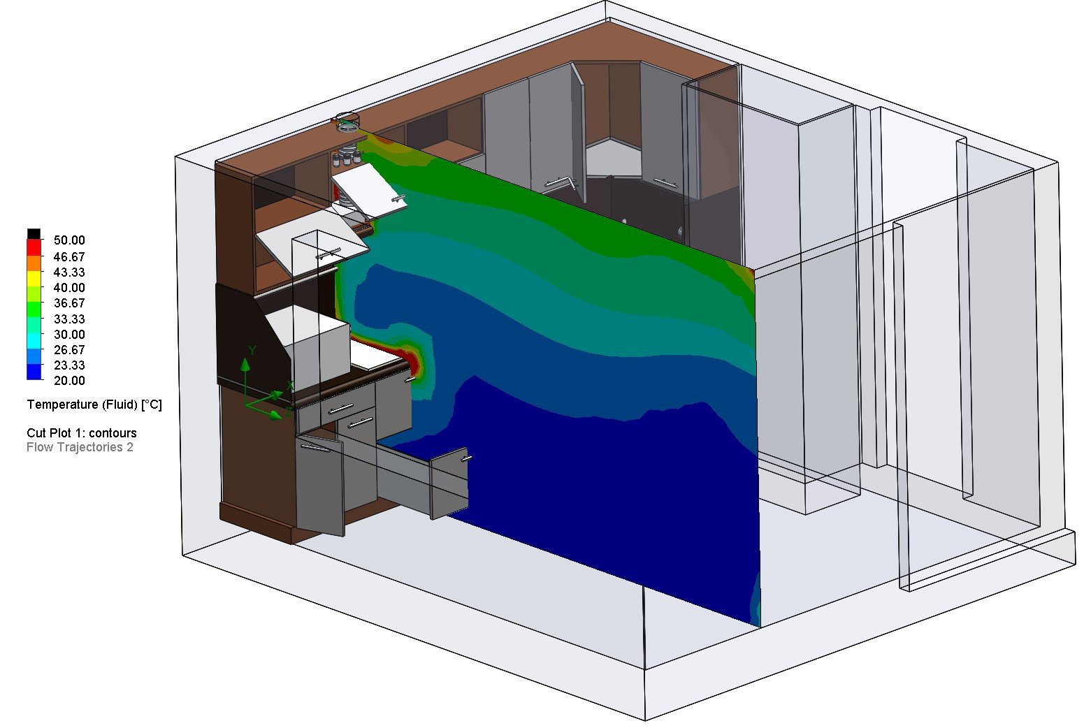 A residential kitchen design required analysis of airflow and heat transfer to ensure comfortable conditions during cooking. The objective was to verify that ventilation effectively removed hot air and cooking fumes, prevented heat buildup near occupants, and maintained a safe, energy-efficient environment.